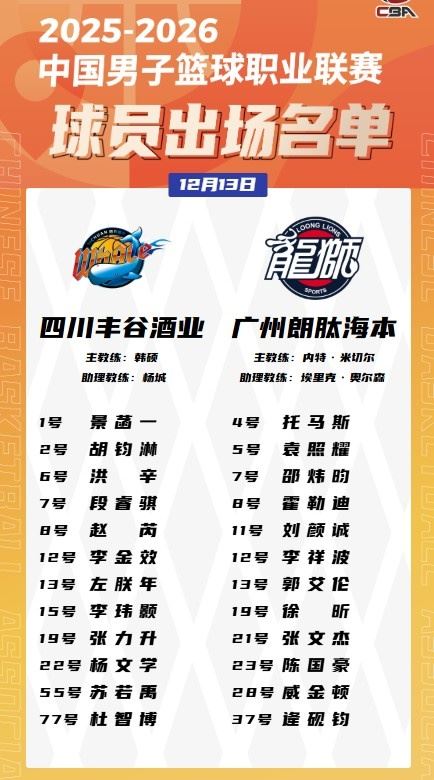 四川VS广州揭幕战大名单:前者全华班 后者由郭艾伦徐昕国豪领衔