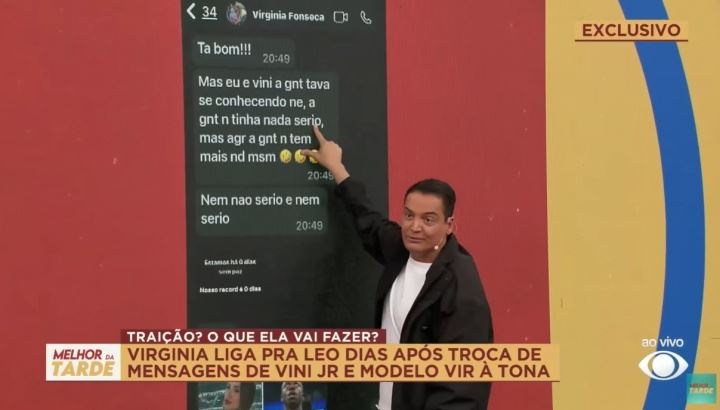 这一系列的聊天记录泄露后,记者Leo Dias又晒出了和弗吉尼亚的一段聊天记录,其中她确认已经与维尼修斯结束关系,她表示:“我和维尼修斯才刚刚认识,本来就不是认真的关系,现在我俩什么关系都没有了!”并且附上了三个笑哭的表情。
